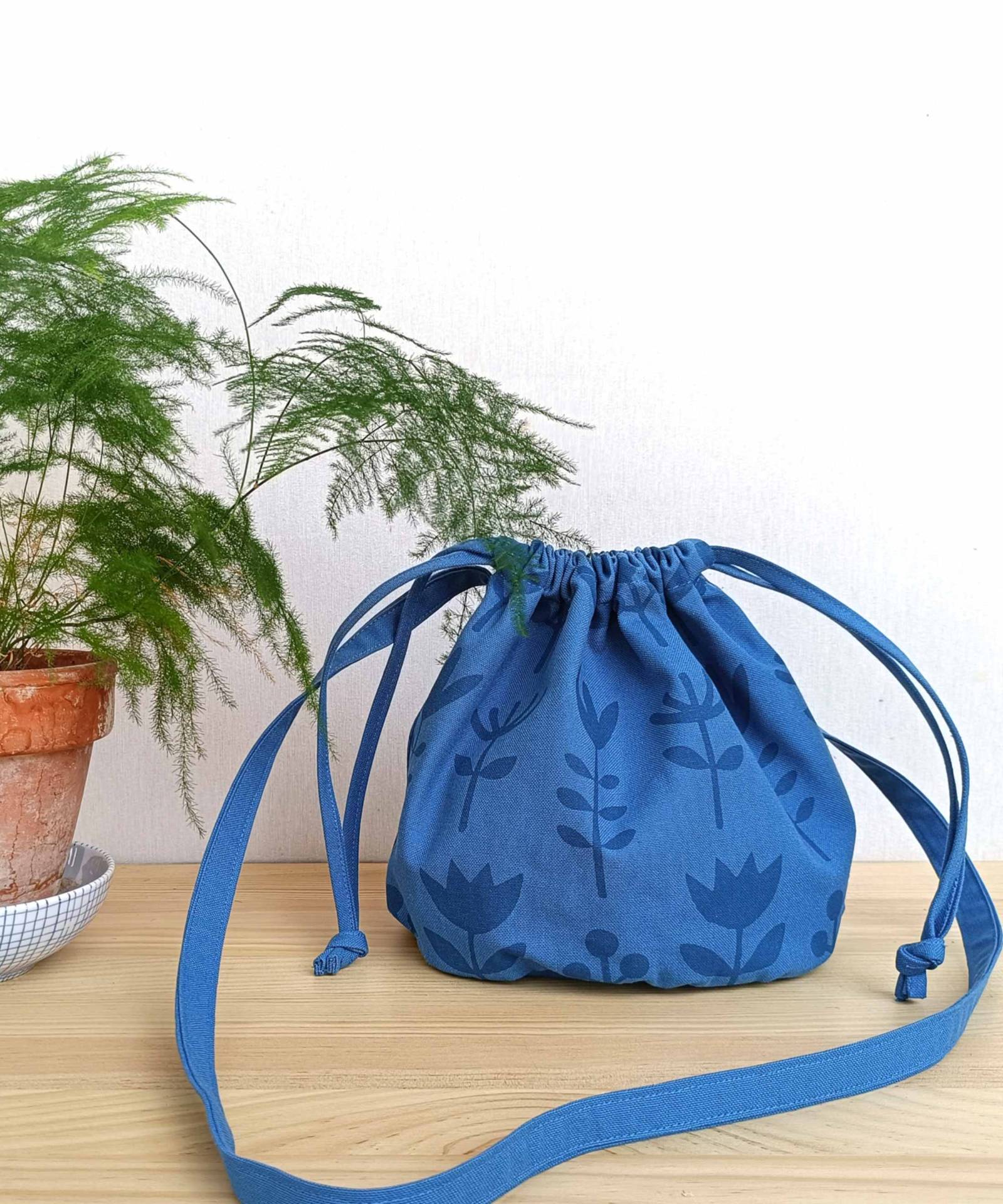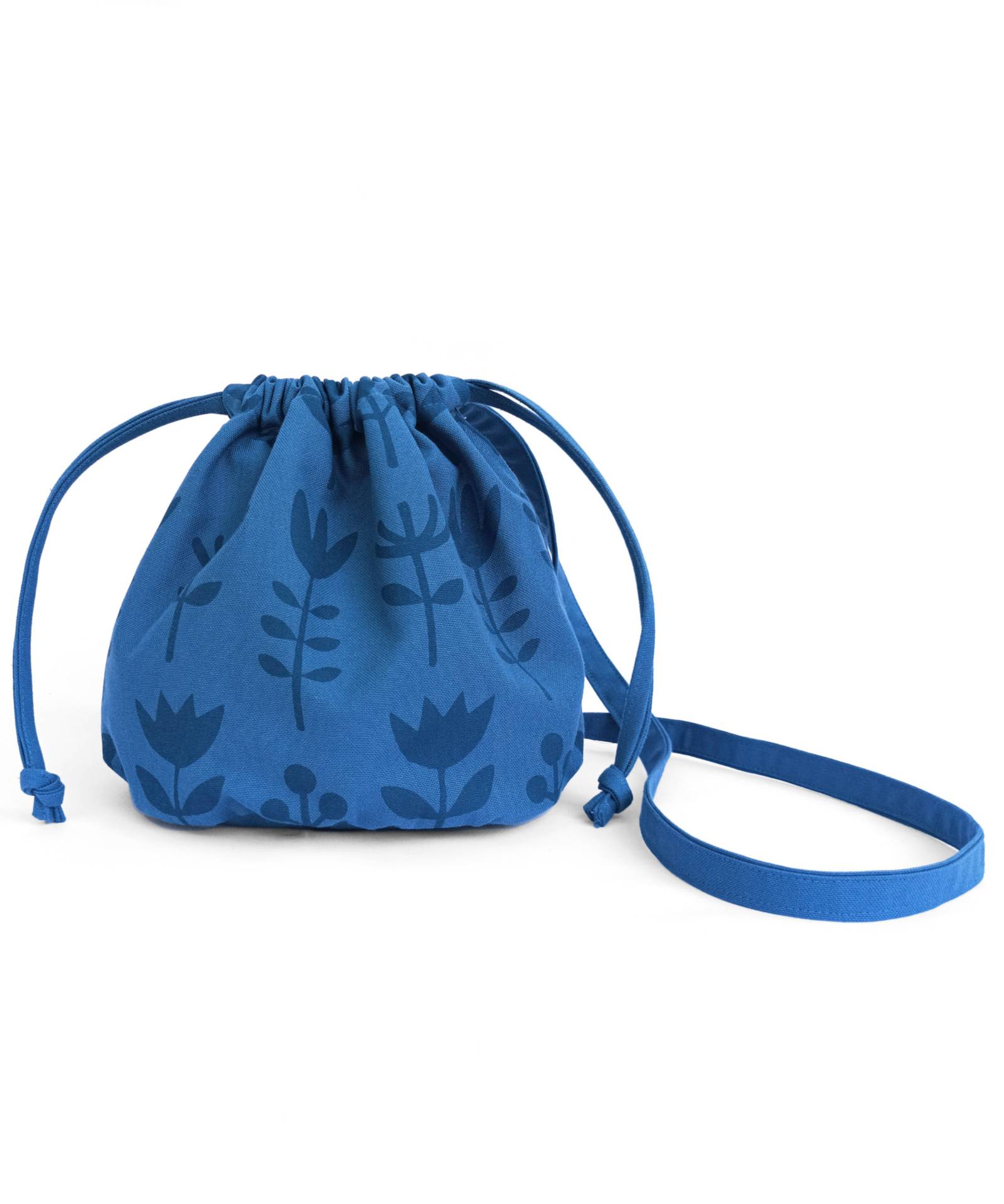 Este pequeño bolso saco se cierra tirando de dos cordones. El asa es suficientemente larga para que puedas llevarlo al hombro o cruzado.