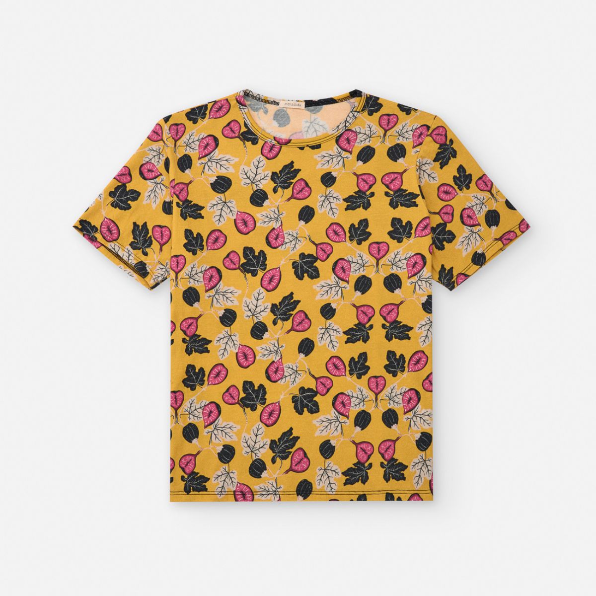 Camiseta en tono mostaza con estampado de higos, un guiño fresco y original a la naturaleza.
