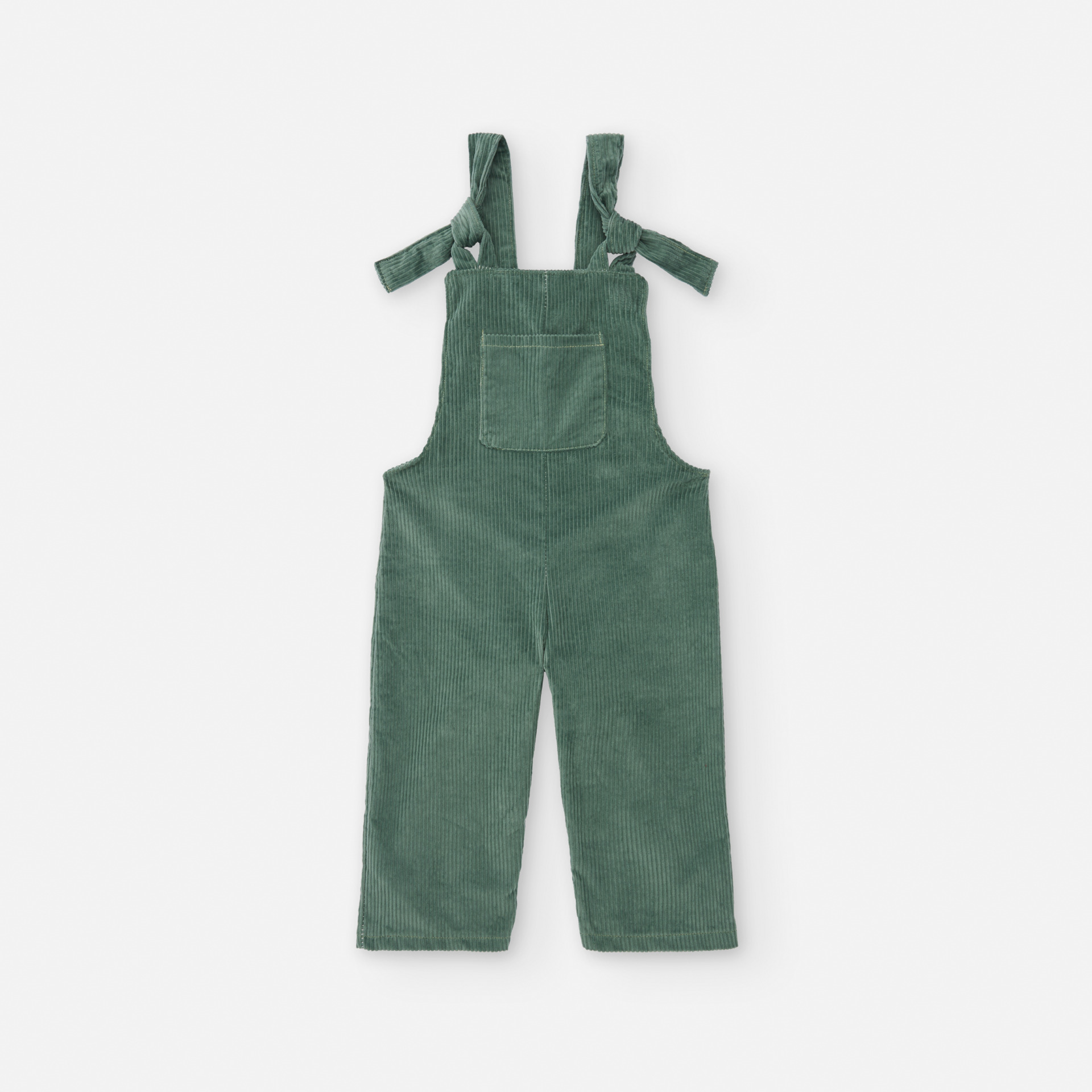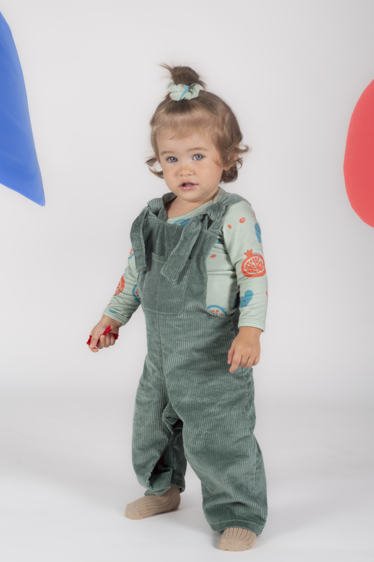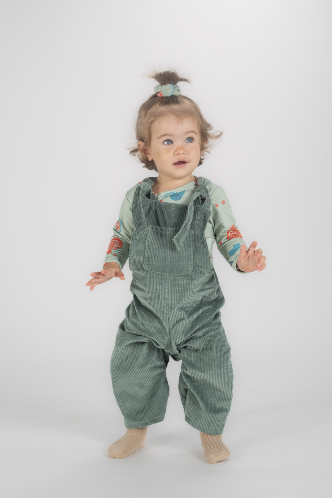 Peto infantil de pana de algodón orgánico color verde con tirantes atados ajustables, diseñado y confeccionado en Mallorca. Corte cómodo que permite movimiento sin restricciones. Tejido suave y flexible que acompaña todos los gestos y juegos diarios. Diseño unisex, fácil de combinar con camisetas, bodies o sudaderas.