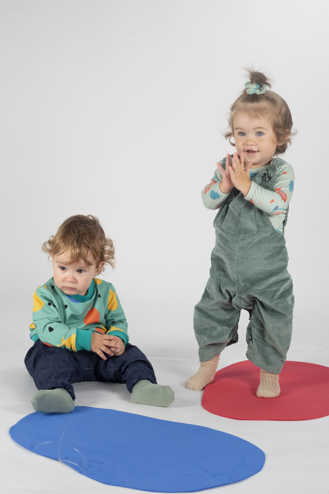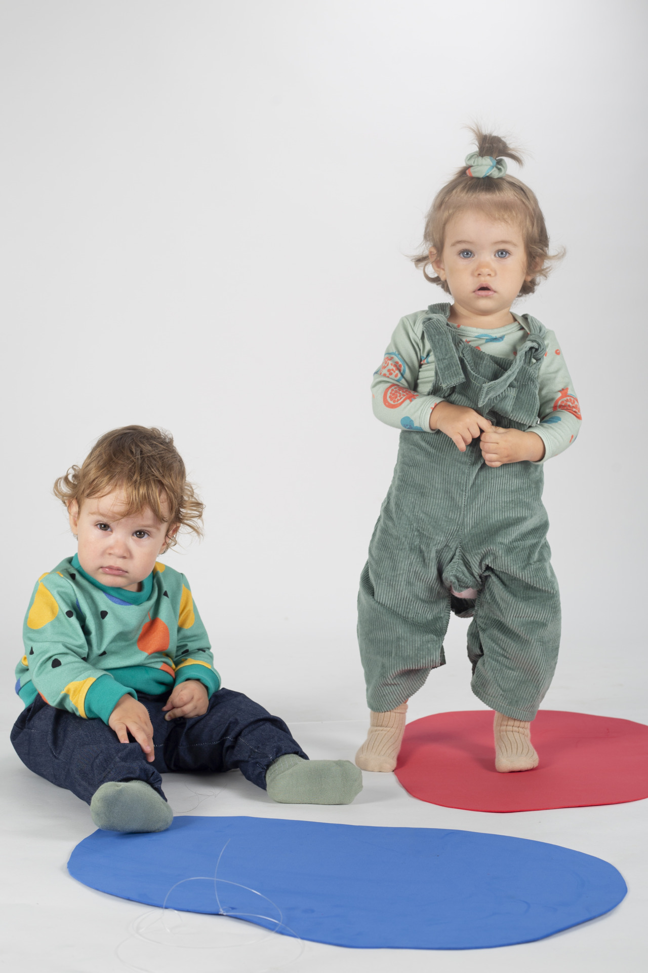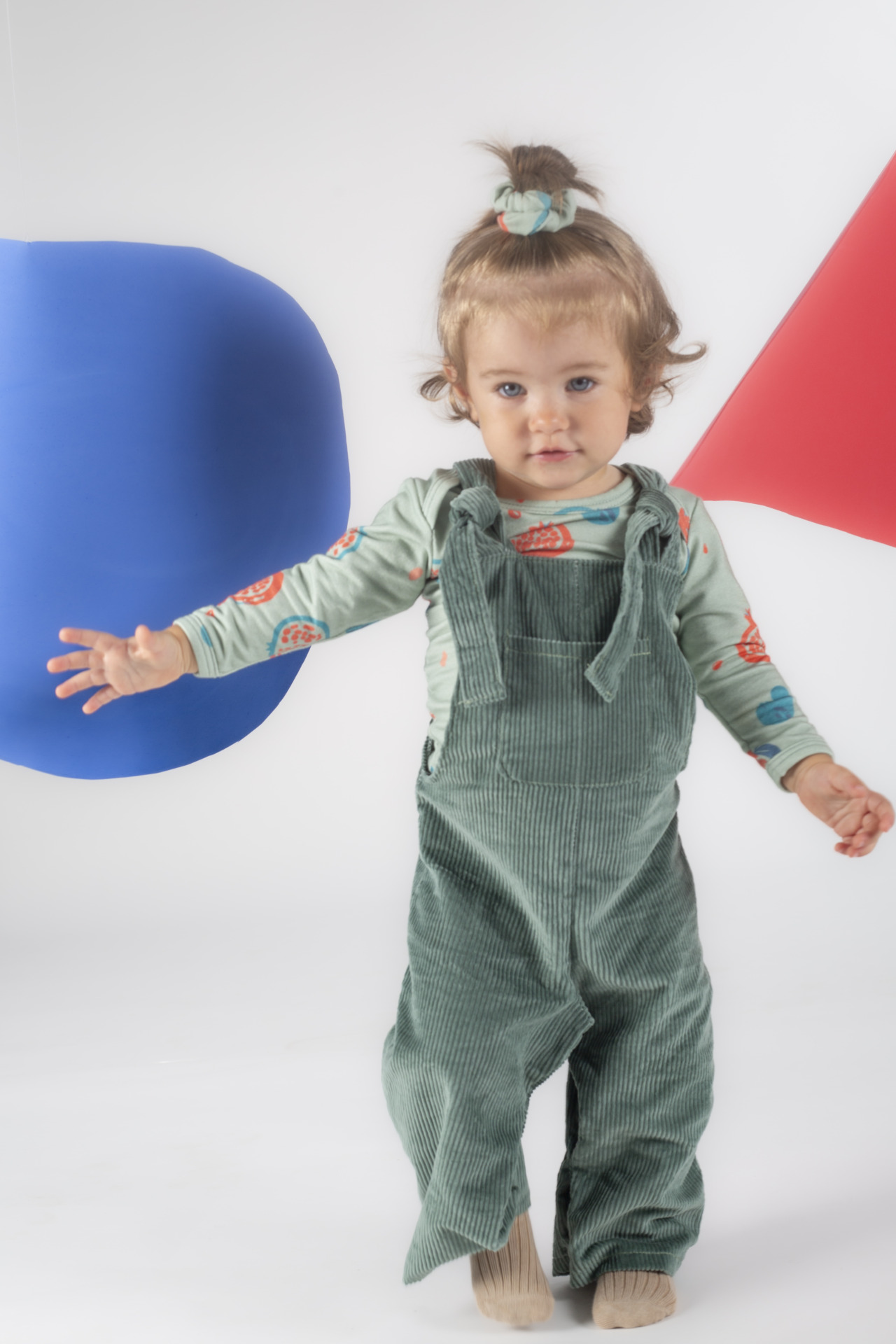 Peto infantil de pana de algodón orgánico color verde con tirantes atados ajustables, diseñado y confeccionado en Mallorca. Corte cómodo que permite movimiento sin restricciones. Tejido suave y flexible que acompaña todos los gestos y juegos diarios. Diseño unisex, fácil de combinar con camisetas, bodies o sudaderas.