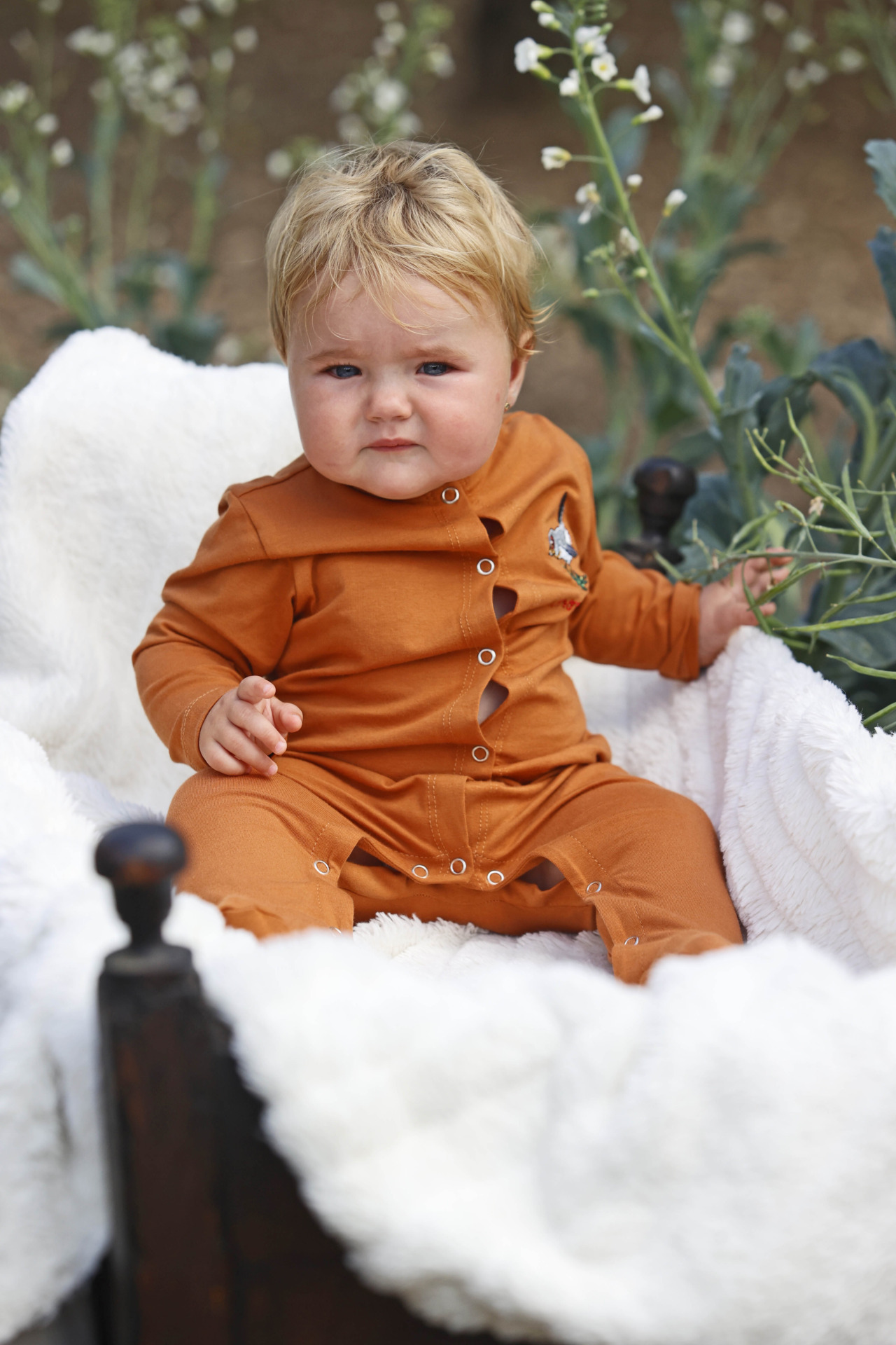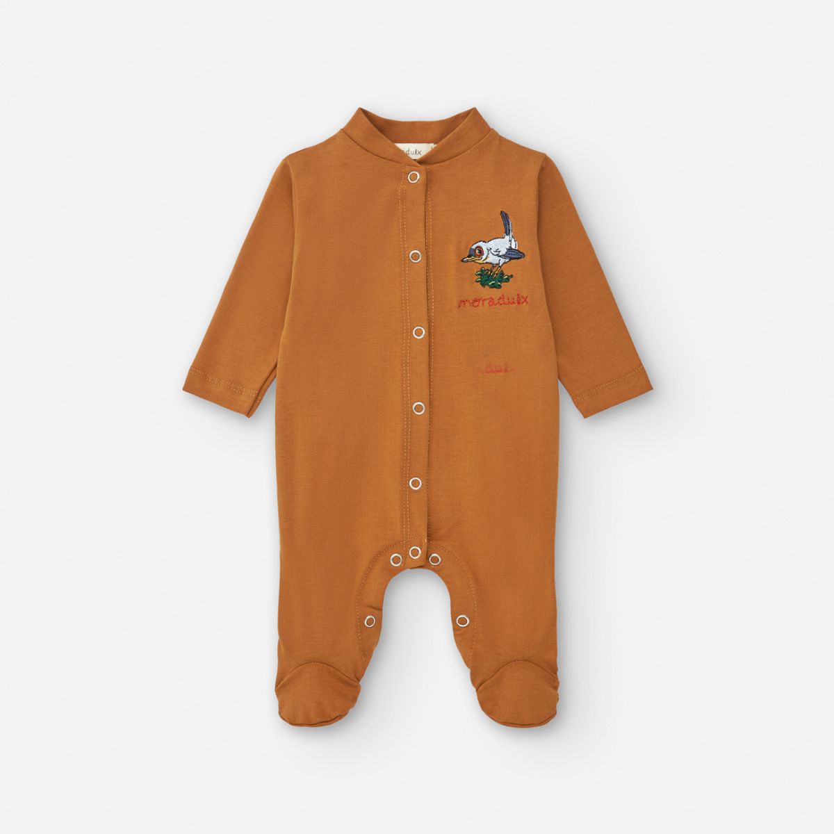 Mono de bebé de manga larga en suave tela de algodón orgánico color tierra bordado. Diseñado y confeccionado en Mallorca para acompañar al bebé en sus primeros meses, ofreciendo total libertad de movimiento y fomentando su autonomía, mantiene a los más pequeños cómodos y abrigados, con un estilo tierno y natural. Cierre con snaps en la entrepierna, que facilita el cambio de pañal y la puesta del mono.