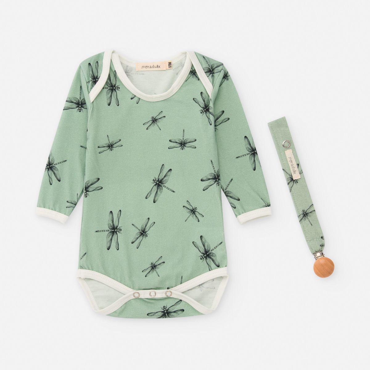 Pack regalo de body y chupetero elaborado en Mallorca con algodón orgánico. El body con estampado exclusivo de libélulas ofrece suavidad, libertad de movimiento y un toque de delicadeza natural. Sus cierres metálicos en la zona del pañal facilitan una puesta rápida y cómoda. El chupetero con pinza de madera, diseñado para sujetarse fácilmente a la ropa del bebé, mantiene el chupete siempre al alcance, fomentando su autonomía. Su cierre metálico y diseño evolutivo garantizan seguridad y durabilidad. Cumple con la normativa europea EN12586:2007 de seguridad.