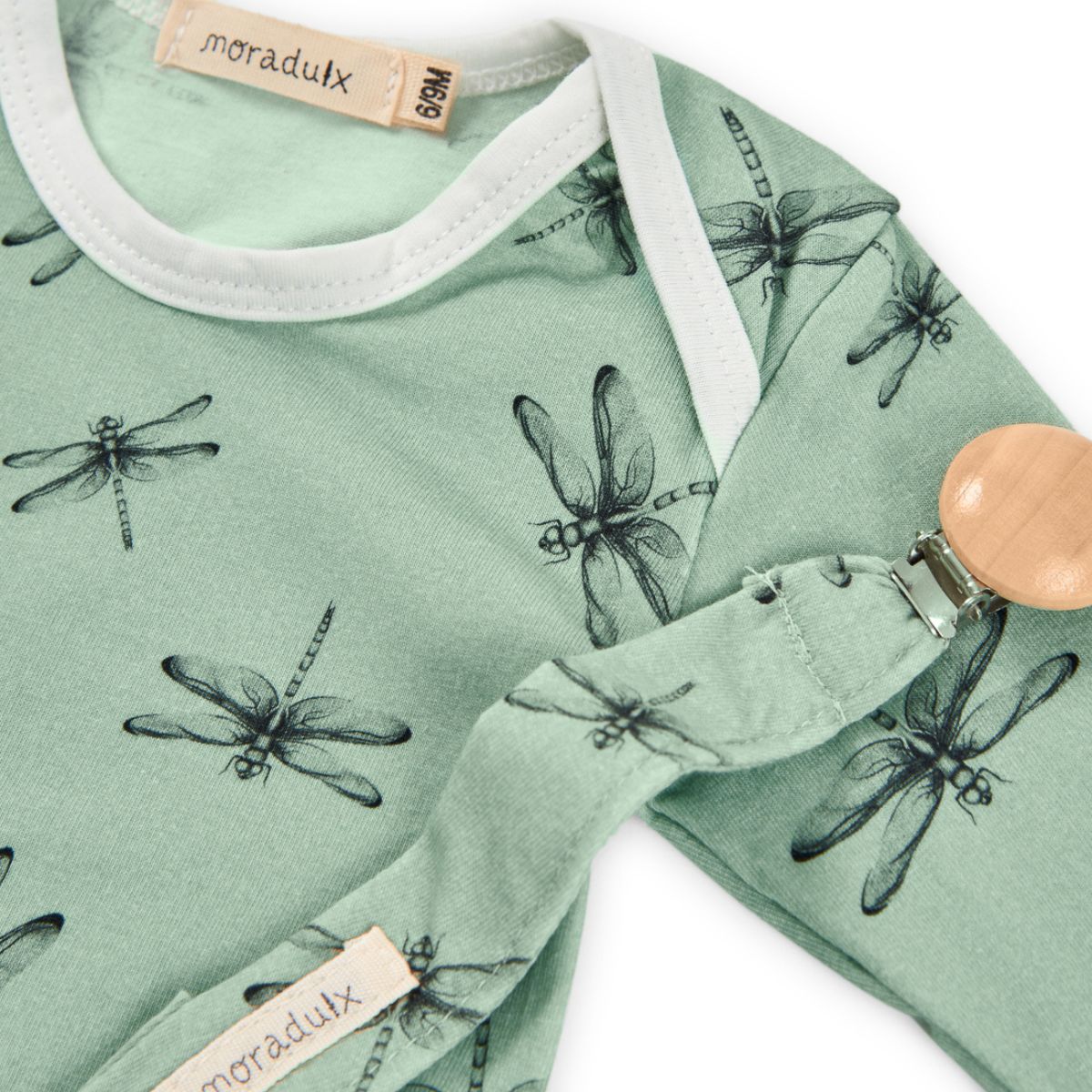 El body con estampado exclusivo de libélulas ofrece suavidad, libertad de movimiento y un toque de delicadeza natural. Sus cierres metálicos en la zona del pañal facilitan una puesta rápida y cómoda.